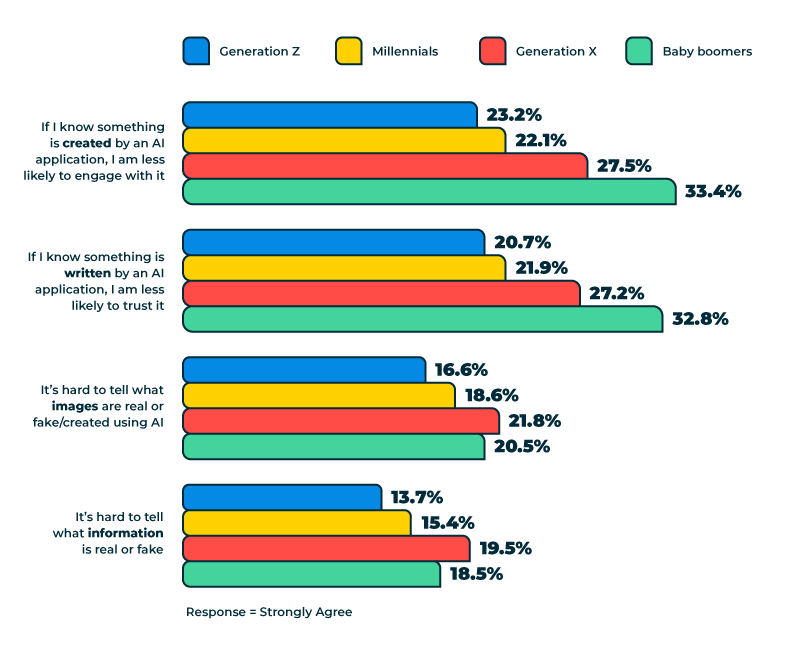 Gen Z, for example, are more likely to claim they know what’s real and what’s created by AI better than other generations. They’re also more likely to trust and engage with AI content. On the other hand, baby boomers are the opposite on all accounts.